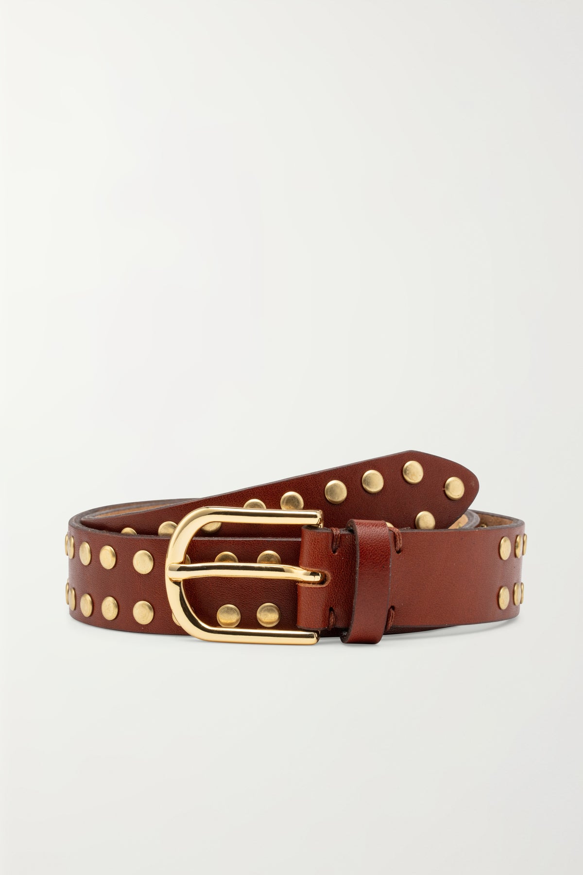 CASANA – Cognac-colored leather belt with shiny gold studs and a matching buckle. A sophisticated statement piece with a cool and feminine expression. 3 cm wide