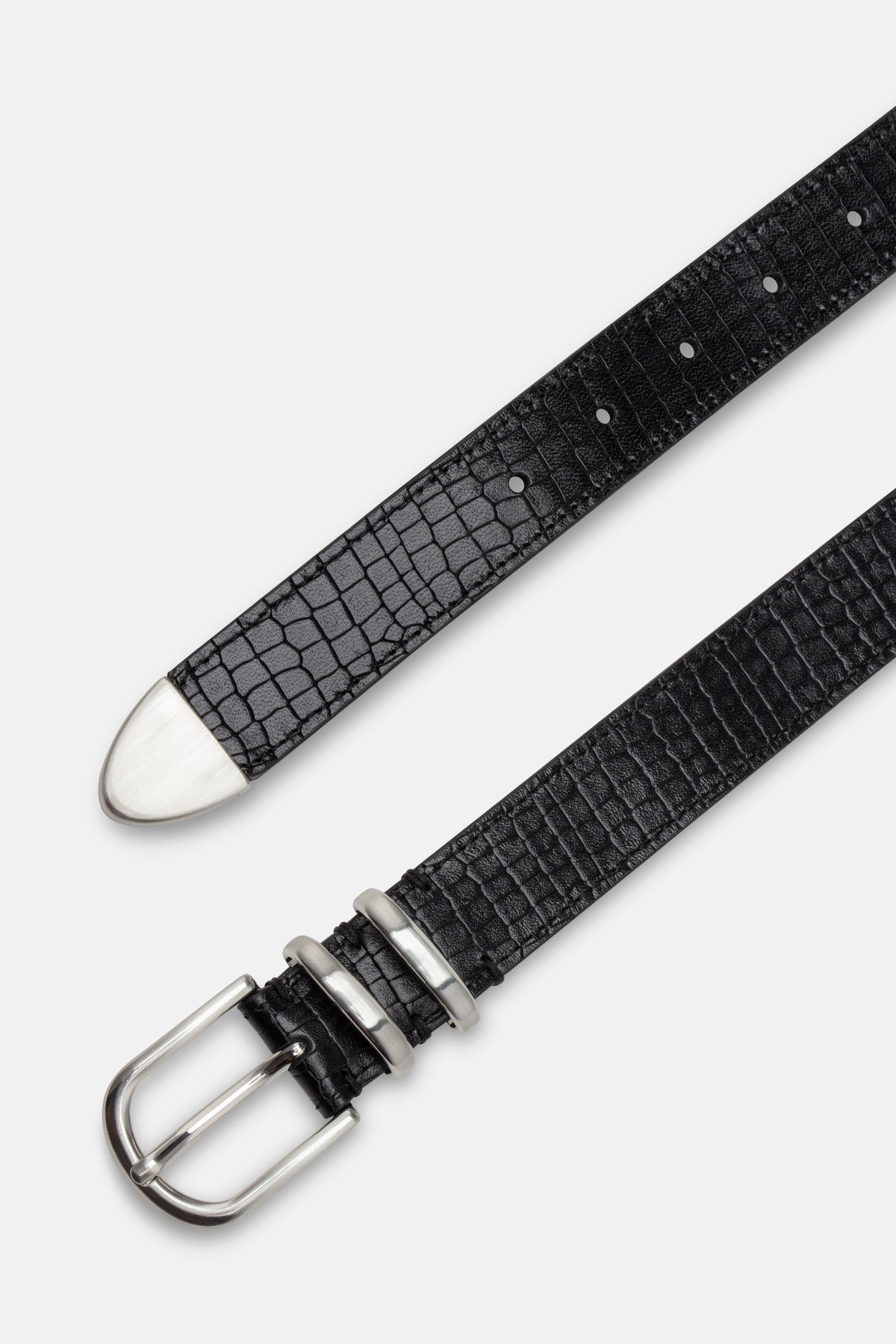 CASANDREA – Black belt in reptile-embossed leather with an elegant silver buckle and double belt loops. A classic design with a modern twist and an exclusive look. 3 cm wide.