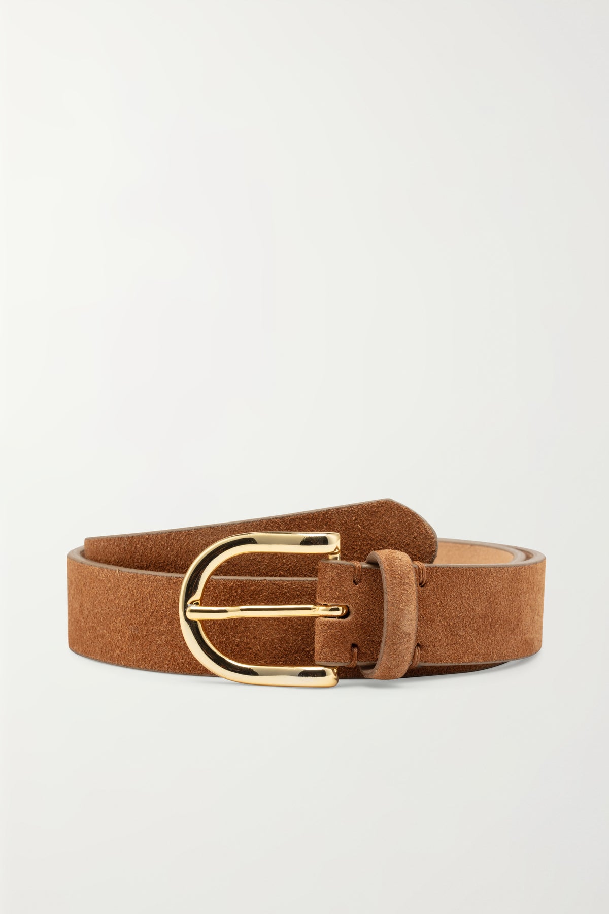 CASCHRISTINA – Simple belt in cognac-colored suede with a gold buckle. A minimalistic and elegant design that adds warmth and exclusivity to any look. 3 cm wide.