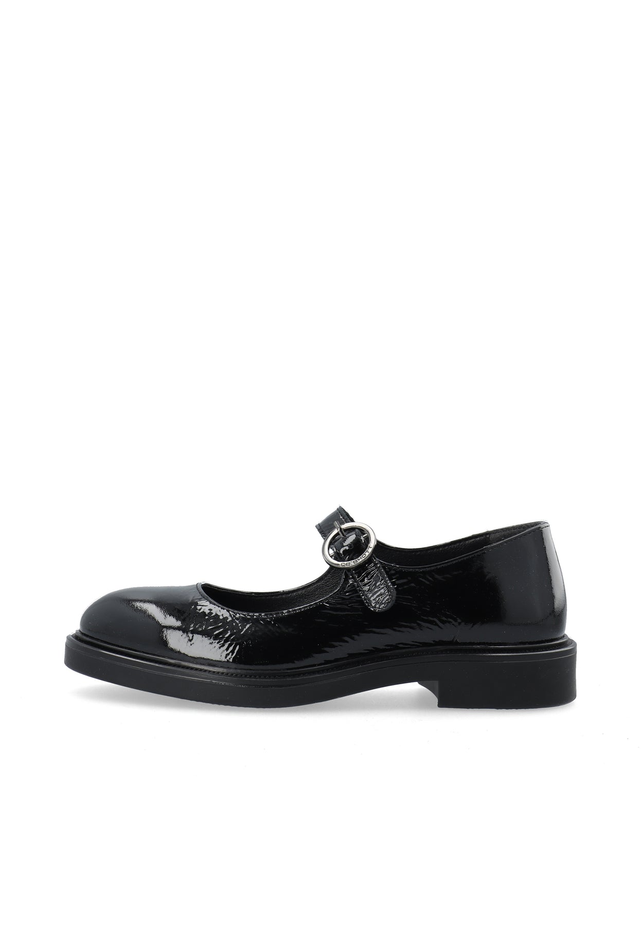 Mary Jane shoes in black patent leather with a round toe and an adjustable strap featuring a silver buckle. The firm sole provides stability and comfort for everyday wear. A feminine and elegant design with a classic look and a modern edge.